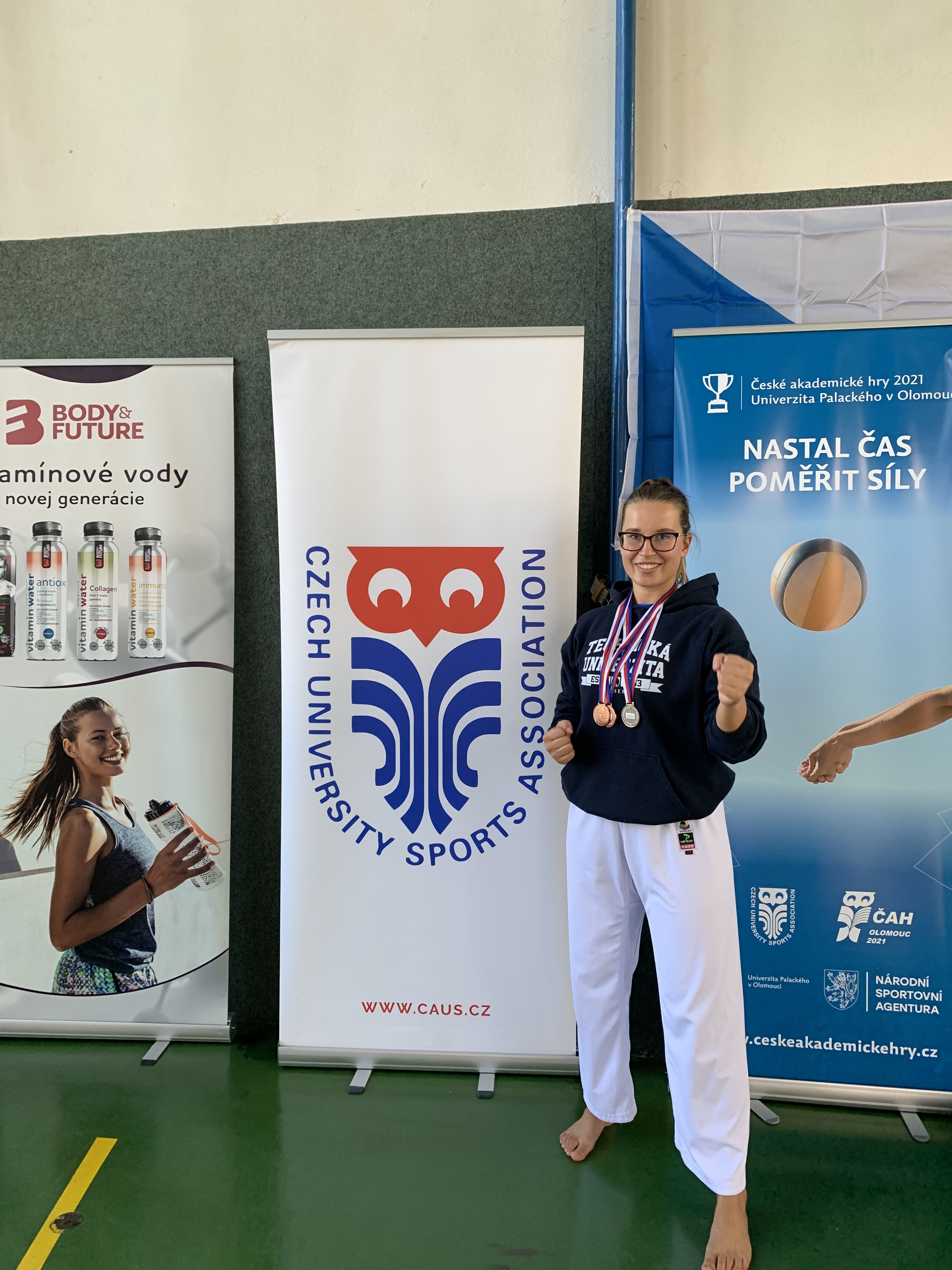 Podařený den měla studentka Fakulty přirodovědně-humanitní a pedagogické (obor tělesná výchova - zeměpis) Barbora Znamenáčková na Českých akademických hrách v Olomouci. Dne 5. 9. 2021 získala v karate tři medaile v kategoriích: