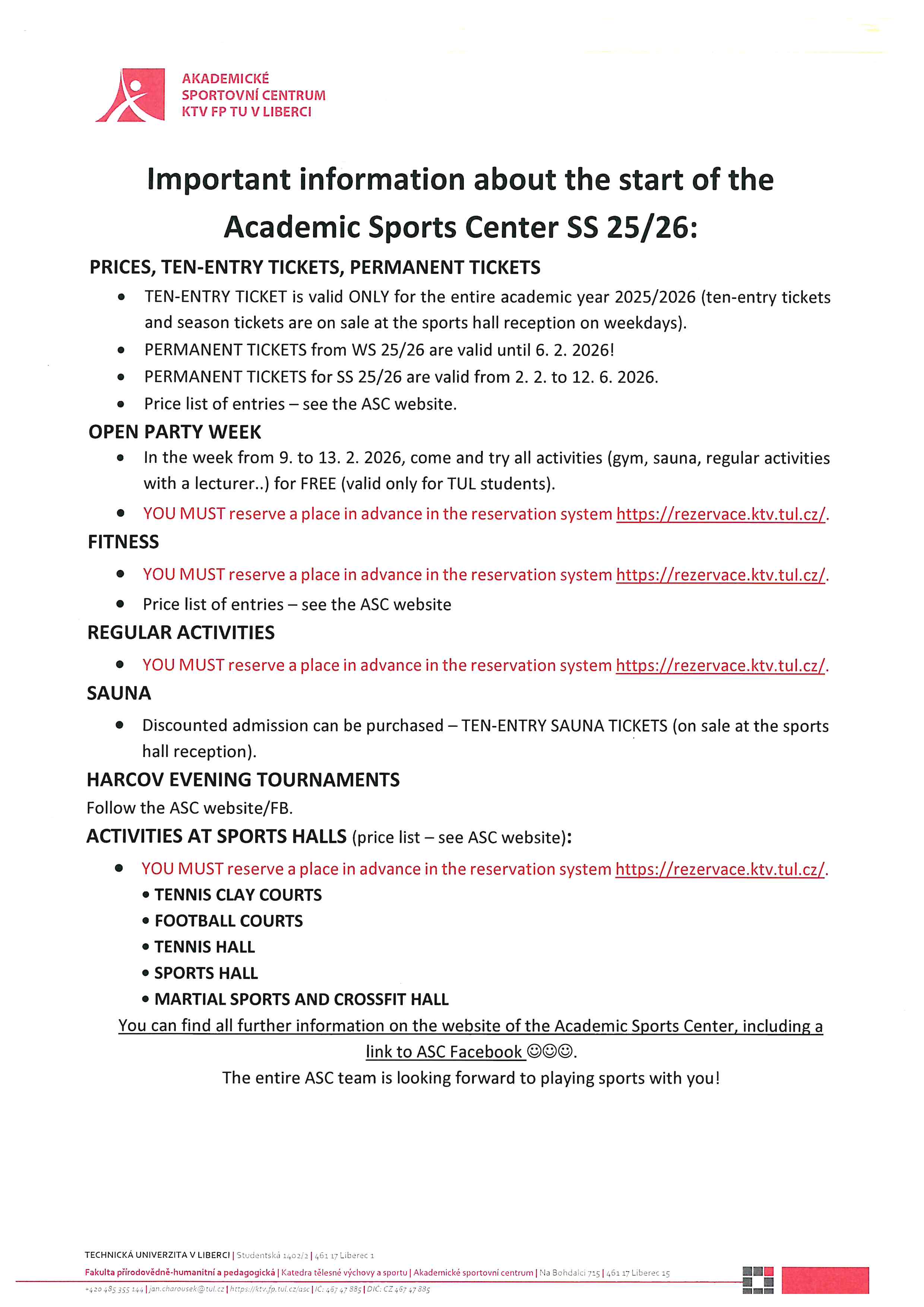 Všechny vítáme v novém AR 2025/26 a přejeme Vám hodně úspěchů. Se začátkem nového AR začíná i provoz ASC a tím pádem i mraky sportování, relaxu a kultury. Již tento týden můžete vyrazit do posilovny případně na první pravidelné aktivity. Nicméně vše vyvrcholí příští týden našim Open párty týdnem, kdy si studenti TUL mohou vyzkoušet řadu aktivit ZDARMA viz informace na plakátech.