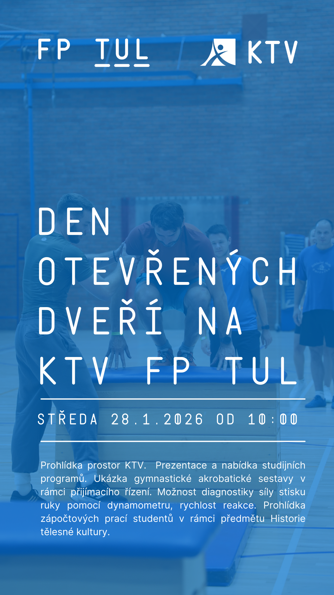 Den otevřených dveří 2026 na Fakultě přírodovědně-humanitní a pedagogické TUL proběhne ve středu 28. 1. 2026. Hlavní informační bloky budou probíhat v univerzitní aule od 9:00 a 11:00 (3. patro budovy G). Po společném úvodu můžete pokračovat přímo k nám na katedru, kde budou probíhat pravidelné prohlídky našich prostor v časech 10:00, 11:00, 12:00, 13:00 a 14:00 a prezentace studijních programů. Prostor bude nejen pro všechny dotazy, ale je možné využít i doprovodného programu: